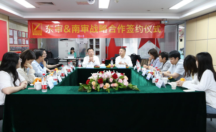 5月17日,北京東審會計師事務(wù)所(特殊普通合伙)(以下簡稱東審)與南京審計大學(xué)(以下簡稱南審)舉辦“人才培育工作專題座談會暨合作簽約儀式”。會議由東審人力資源郭冉主持,東審創(chuàng)始人崔軍勝、集團(tuán)合伙人王洪玉、李麗,養(yǎng)老金合伙人趙菲以及南審副校長裴育、經(jīng)濟(jì)學(xué)院黨委書記孫國鋒、雙創(chuàng)中心主任萬樹、系主任李丹等領(lǐng)導(dǎo)共同出席。優(yōu)秀學(xué)生代表馬思露、高艷玲也參與了此次會議。