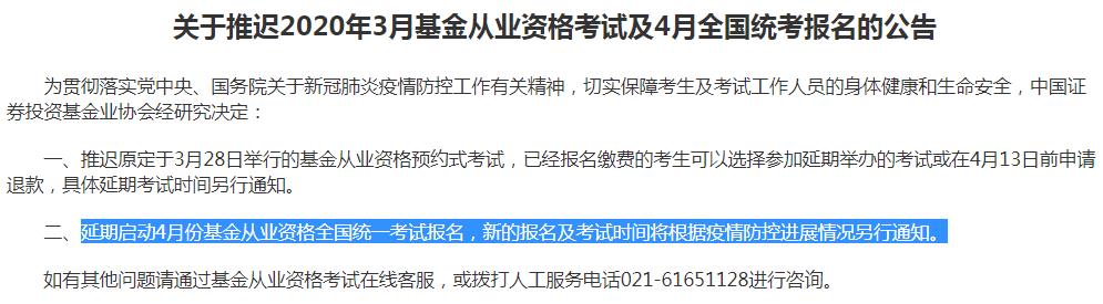 中國(guó)證券投資基金業(yè)協(xié)會(huì)延期啟動(dòng)4月份基金從業(yè)資格全國(guó)統(tǒng)一考試報(bào)名,新的報(bào)名及考試時(shí)間將根據(jù)疫情防控進(jìn)展情況另行通知。