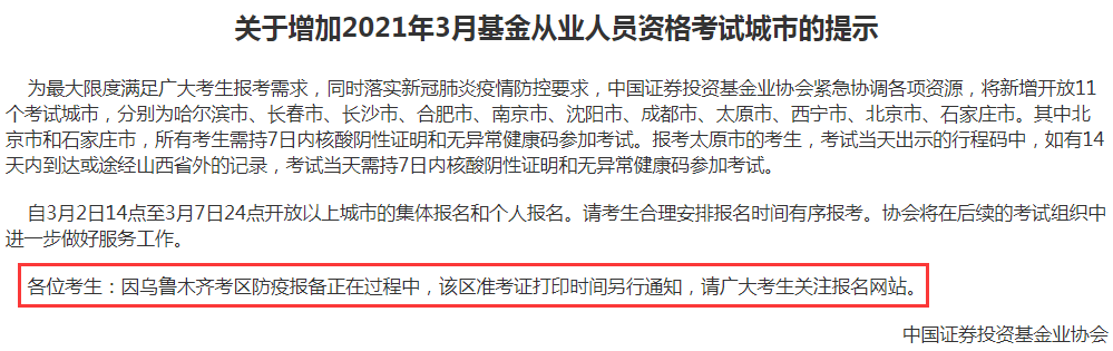 各位考生:因烏魯木齊考區(qū)防疫報備正在過程中,該區(qū)準(zhǔn)考證打印時間另行通知,請廣大考生關(guān)注報名網(wǎng)站。