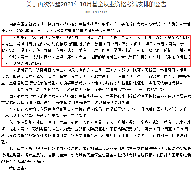 請(qǐng)廣大考生密切關(guān)注各城市疫情防控要求,期間基金從業(yè)資格考試有關(guān)安排將按照各地疫情防控情況進(jìn)行相應(yīng)調(diào)整,請(qǐng)考生及時(shí)關(guān)注相關(guān)通知。如有其他問(wèn)題請(qǐng)通過(guò)基金從業(yè)資格考試在線客服,或撥打人工服務(wù)電話021-61948893進(jìn)行咨詢。