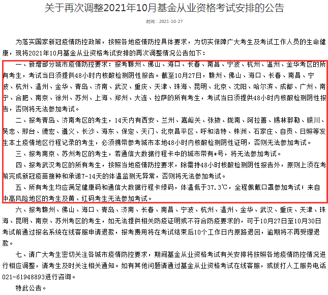 為落實(shí)國(guó)家新冠疫情防控政策,按照各地疫情防控具體要求,為切實(shí)保障廣大考生及考試工作人員的生命健康,現(xiàn)將2021年10月基金從業(yè)資格考試安排的再次調(diào)整情況公告如下: