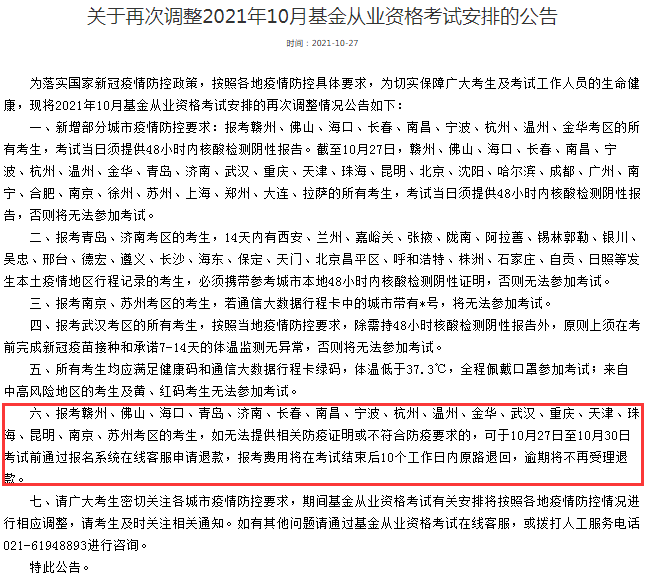 報(bào)考贛州、佛山、?、青島、濟(jì)南、長春、南昌、寧波、杭州、溫州、金華、武漢、重慶、天津、珠海、昆明、南京、蘇州考區(qū)的考生,如無法提供相關(guān)防疫證明或不符合防疫要求的,可于10月27日至10月30日考試前通過報(bào)名系統(tǒng)在線客服申請退款,報(bào)考費(fèi)用將在考試結(jié)束后10個工作日內(nèi)原路退回,逾期將不再受理退款。