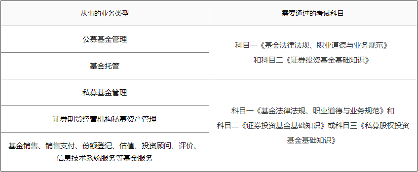 基金從業(yè)人員應(yīng)根據(jù)所從事基金業(yè)務(wù)類型,按照下表選擇參加考試科目: