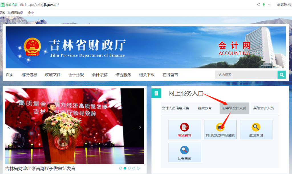 方法二:吉林會計網(wǎng)首頁,“網(wǎng)上服務(wù)入口----初中級會計人員----打印2020年報名表。