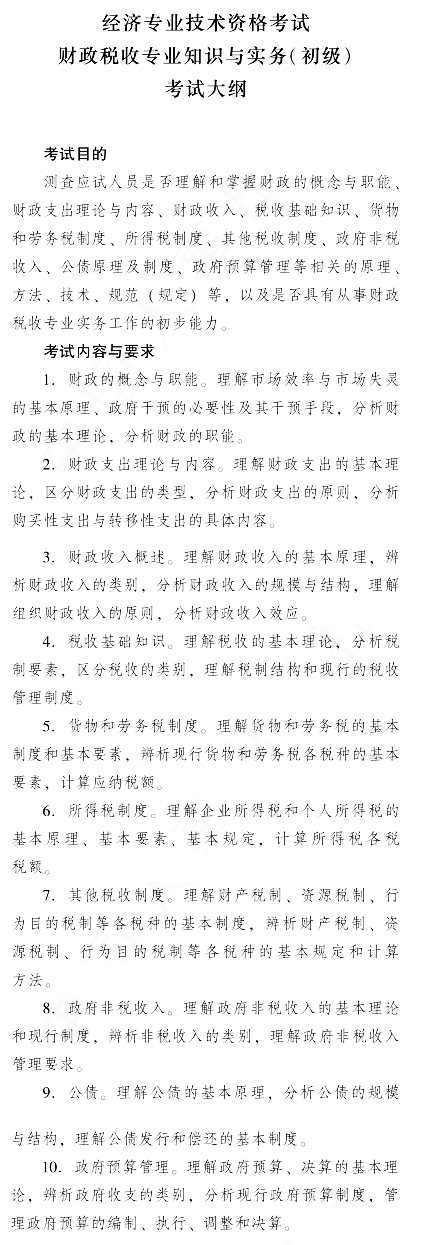 2019年經(jīng)濟師考試大綱現(xiàn)已正式公布!以下是2019年初級經(jīng)濟師《財政稅收專業(yè)知識與實務(wù)》考試大綱。