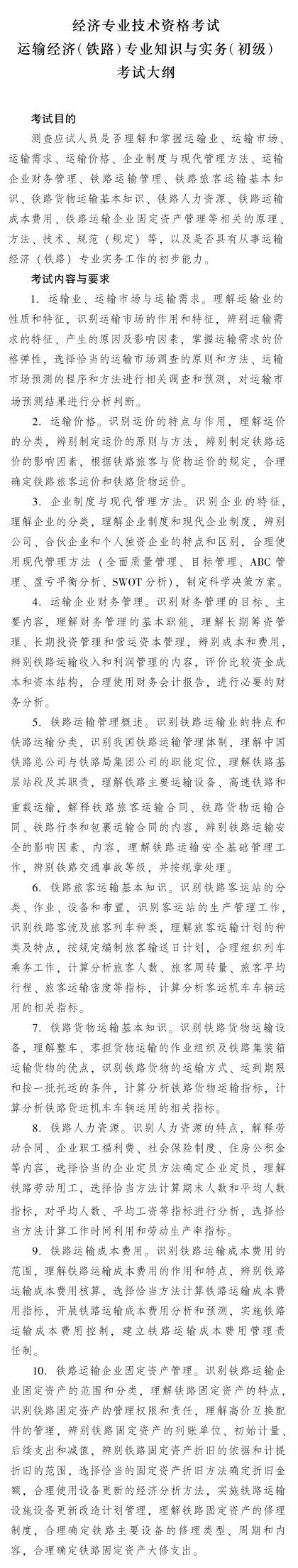 2019年經(jīng)濟(jì)師考試大綱現(xiàn)已正式公布!以下是2019年初級經(jīng)濟(jì)師《運(yùn)輸(鐵路)專業(yè)知識與實(shí)務(wù)》考試大綱。
