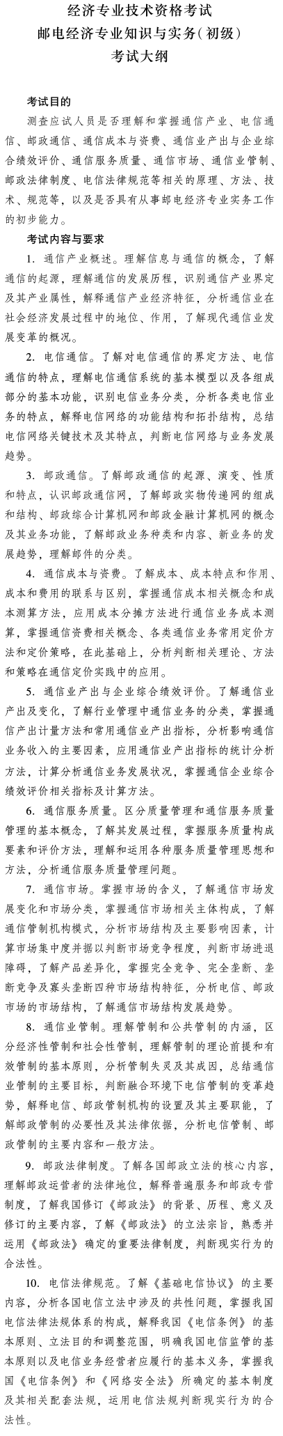 2019年經(jīng)濟師考試大綱現(xiàn)已正式公布!以下是2019年初級經(jīng)濟師《郵電專業(yè)知識與實務(wù)》考試大綱。