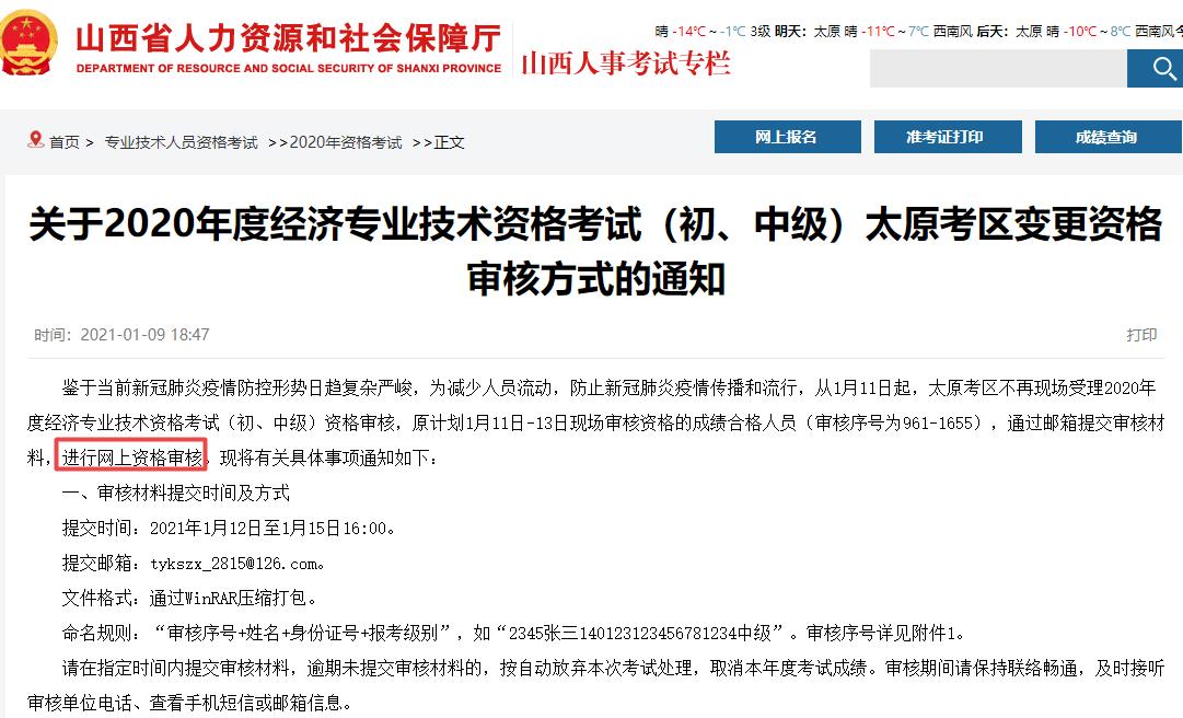 鑒于當(dāng)前新冠肺炎疫情防控形勢(shì)日趨復(fù)雜嚴(yán)峻,為減少人員流動(dòng),防止新冠肺炎疫情傳播和流行,從1月11日起,太原考區(qū)不再現(xiàn)場(chǎng)受理2020年度經(jīng)濟(jì)專業(yè)技術(shù)資格考試(初、中級(jí))資格審核,原計(jì)劃1月11日-13日現(xiàn)場(chǎng)審核資格的成績(jī)合格人員(審核序號(hào)為961-1655),通過(guò)郵箱提交審核材料,進(jìn)行網(wǎng)上資格審核。