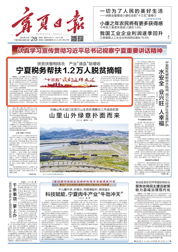彭陽縣孟塬鄉(xiāng)牛耳塬村農(nóng)民蘇銀遭遇車禍,兩次手術(shù)花光了賠款和積蓄。駐村工作隊為他申請5萬元金融扶貧小額信貸,購買6頭基礎(chǔ)母牛,并給予每頭基礎(chǔ)母牛1000元的扶助資金,幫助他重新發(fā)展養(yǎng)牛項目。還給他4000元建房補(bǔ)貼,加上縣、鄉(xiāng)幫助落實(shí)危房危窯改造配套資金3萬元,全家高高興興地搬進(jìn)了新房。 本著“以產(chǎn)業(yè)‘造血’助群眾增收”的理念,寧夏稅務(wù)部門累計引進(jìn)幫扶資金681.3萬元,引進(jìn)4家企業(yè)投資224萬元,扶持龍頭企業(yè)和農(nóng)村合作社19家,幫助銷售貧困地區(qū)農(nóng)產(chǎn)品122.5萬元,有力推動了貧困村經(jīng)濟(jì)發(fā)展。