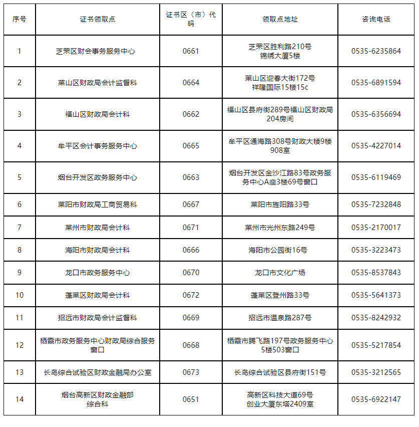 2、發(fā)放時(shí)間、地點(diǎn)。我市集中發(fā)放時(shí)間為2021年2月1日-3月10日(周末及國(guó)家法定節(jié)假日除外)?忌梢缘綀(bào)名所在地縣級(jí)財(cái)政部門(mén)領(lǐng)取證書(shū),也可以按照證書(shū)管理號(hào)查詢所屬縣級(jí)財(cái)政部門(mén)。證書(shū)管理號(hào)第六至九位,為領(lǐng)取地的區(qū)(市)財(cái)政局代碼,如XXXXX0661XXXXX,領(lǐng)取地點(diǎn)為芝罘區(qū)財(cái)政局。各區(qū)(市)財(cái)政局代碼及領(lǐng)取地點(diǎn)、咨詢電話詳見(jiàn)附件1。