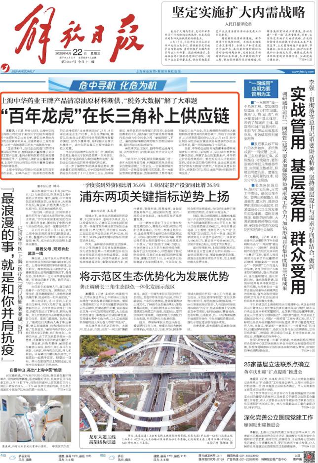 上海中華藥業(yè)有限公司是著名的百年制藥企業(yè),王牌產(chǎn)品之一就是老百姓熟悉的乙類中成藥“龍虎牌清涼油”。3月、4月本應是企業(yè)生產(chǎn)旺季,卻因疫情影響,需要從印度進口的原材料藥用級薄荷腦暫停供應,僅有少量庫存。原料難以支撐大批量生產(chǎn),是中華藥業(yè)復工過程中遇到的最大難題。