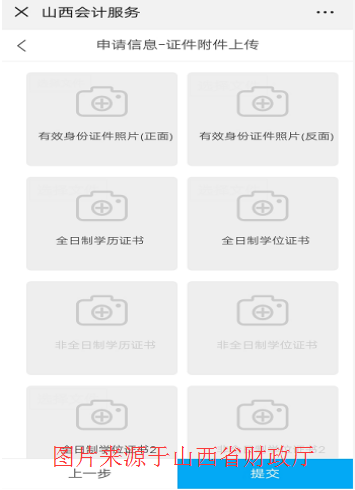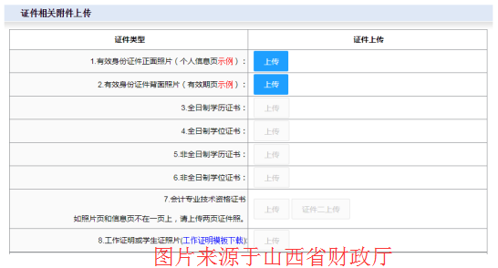 證件上傳會(huì)根據(jù)會(huì)計(jì)人員在之前填寫(xiě)的信息自動(dòng)設(shè)置,【上傳】字樣高亮顯示時(shí),為需要上傳附件的項(xiàng)目,工作證明需下載模板填寫(xiě)后再上傳。