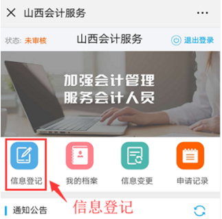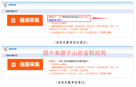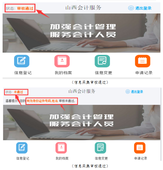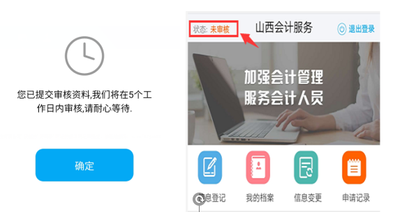 手機(jī)微信端提交后,進(jìn)入等待審核環(huán)節(jié),會(huì)計(jì)人員可在登錄首頁(yè)查詢信息審核狀態(tài),顯示“審核通過(guò)”即為完成信息采集。