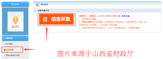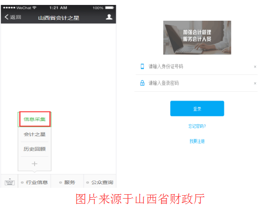 會(huì)計(jì)人員可使用電腦登錄會(huì)計(jì)之星網(wǎng)站(http://www.kjzx.cn),進(jìn)入首頁(yè)“會(huì)計(jì)人員信息采集”專區(qū),或手機(jī)微信添加公眾號(hào)“山西省會(huì)計(jì)之星”點(diǎn)擊“行業(yè)信息”菜單中的“信息采集”。