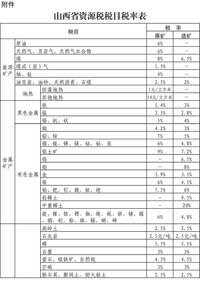 山西省人民代表大會常務委員會關(guān)于資源稅具體適用稅率等有關(guān)事項的決定 (2020年7月31日山西省第十三屆人民代表大會常務委員會第十九次會議通過) 根據(jù)《中華人民共和國資源稅法》,現(xiàn)就本省資源稅具體適用稅率、計征方式及減征免征事項決定如下: 一、資源稅適用稅率,按照本決定所附《山西省資源稅稅目稅率表》執(zhí)行。 二、地熱、石灰?guī)r、其他粘土、砂石、礦泉水實行從量計征,天然鹵水實行從價計征。 三、有下列情形之一的,減征或者免征資源稅: (一)納稅人開采或者生產(chǎn)應稅產(chǎn)品過程中,因意外事故或者自然災害等原因遭受重大損失的,減征當年度百分之三十資源稅,但減稅額不超過當年度直接經(jīng)濟損失的百分之三十。 (二)納稅人開采共伴生礦、低品位礦的,依據(jù)地質(zhì)勘查報告和礦產(chǎn)資源儲量備案證明,減征百分之三十資源稅。 (三)納稅人開采尾礦的,免征資源稅。 四、本決定自2020年9月1日起施行。 附件: