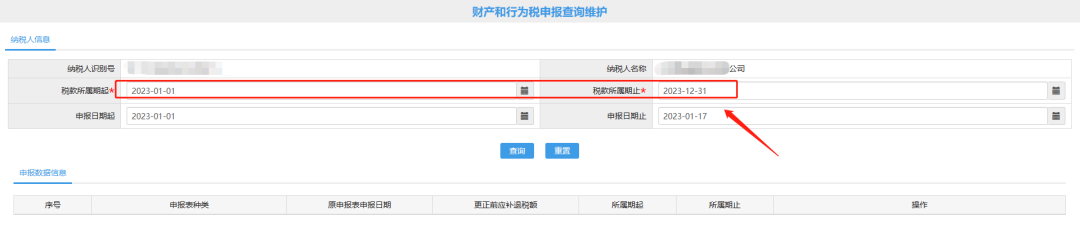 四、財(cái)產(chǎn)和行為稅申報(bào)查詢維護(hù)頁(yè)面,選擇正確的稅款所屬期查詢即可。