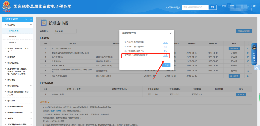 三、選擇財(cái)產(chǎn)和行為稅申報(bào)查詢維護(hù),點(diǎn)擊右方的申報(bào)。