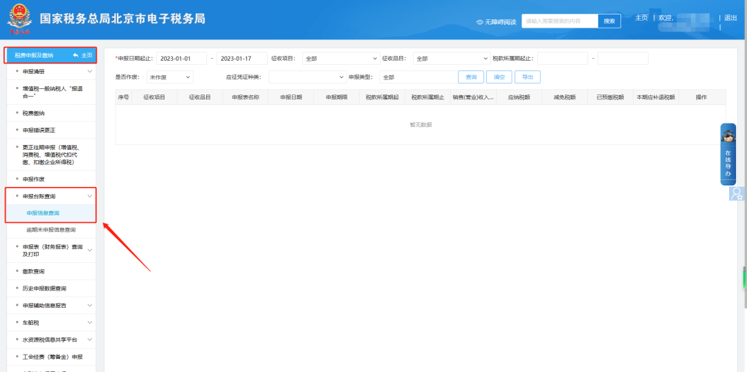 二、稅費(fèi)申報(bào)及繳納—申報(bào)臺(tái)賬查詢—申報(bào)信息查詢,這里可以查到申報(bào)記錄并且作廢標(biāo)志是“否”,說(shuō)明申報(bào)成功。