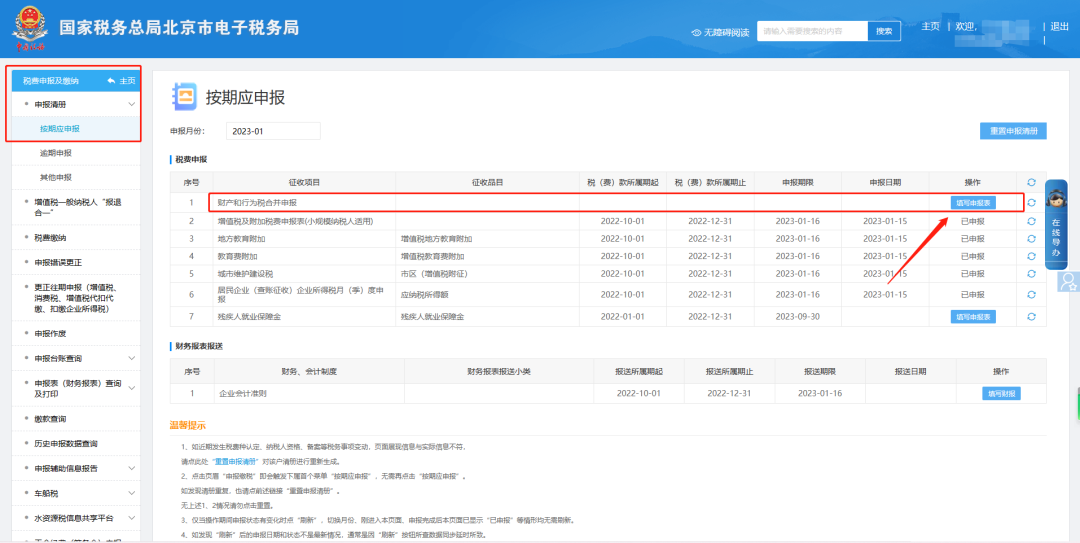 二、稅費(fèi)申報(bào)及繳納—申報(bào)清冊(cè)—按期應(yīng)申報(bào)—財(cái)產(chǎn)和行為稅合并申報(bào),點(diǎn)擊填寫申報(bào)表。
