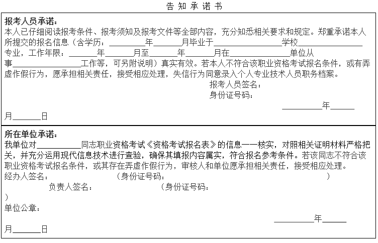 三、 資格審查使用統(tǒng)一制發(fā)的《資格考試報(bào)名表》和《告知承諾書》,報(bào)考人員、所在單位、人力資源社會(huì)保障部門在表內(nèi)相應(yīng)欄目?jī)?nèi)簽名蓋章,資格審查部門不得再自行增設(shè)簽章環(huán)節(jié)。
