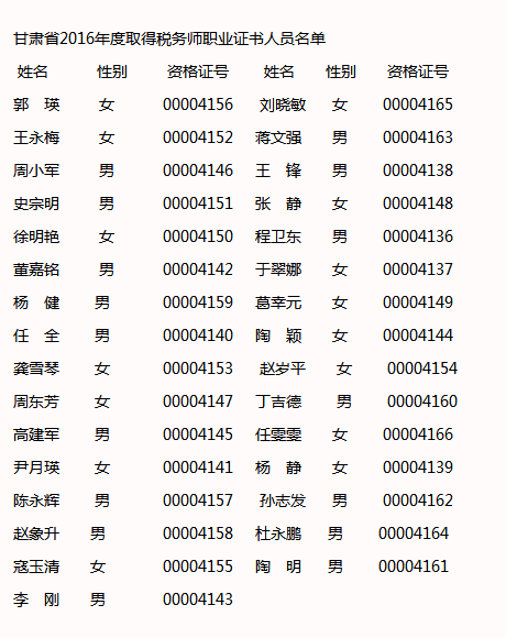 甘肅省2016年度取得稅務(wù)師職業(yè)證書人員名單出爐,現(xiàn)將2016年通過稅務(wù)師職業(yè)資格考試人員予以公告。
