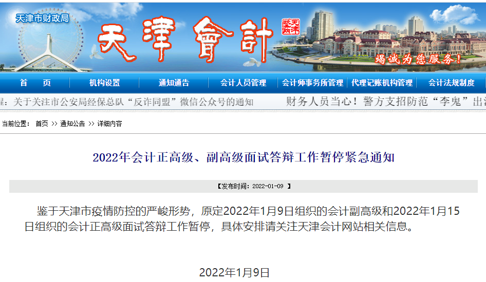 鑒于天津市疫情防控的嚴(yán)峻形勢(shì),原定2022年1月9日組織的會(huì)計(jì)副高級(jí)和2022年1月15日組織的會(huì)計(jì)正高級(jí)面試答辯工作暫停,具體安排請(qǐng)關(guān)注天津會(huì)計(jì)網(wǎng)站相關(guān)信息。