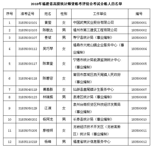 2018年福建省高級(jí)統(tǒng)計(jì)師資格考評(píng)結(jié)合考試合格人員名單