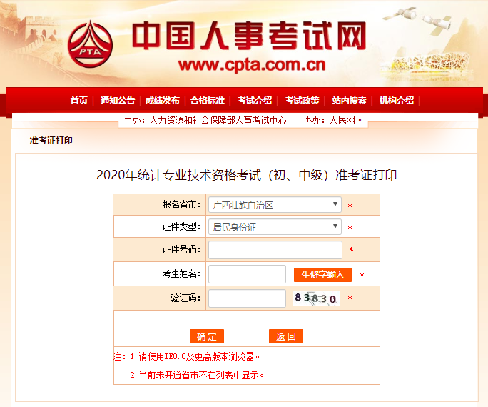 中國人事考試網(wǎng)開通了2020年廣西統(tǒng)計師準(zhǔn)考證打印入口,報名廣西統(tǒng)計師考試的考生可輸入證件號、姓名看是否可以打印,如輸入后提示尚未開通,請考生按原定時間再進行打印。(根據(jù)2020年廣西統(tǒng)計師報名公告,2020年10月12日至10月17日,網(wǎng)上已繳費考生登錄報名網(wǎng)站自行打印準(zhǔn)考證,須打印出照片的準(zhǔn)考證, 黑白、彩色均可,無照片或自貼照片的準(zhǔn)考證無效。)