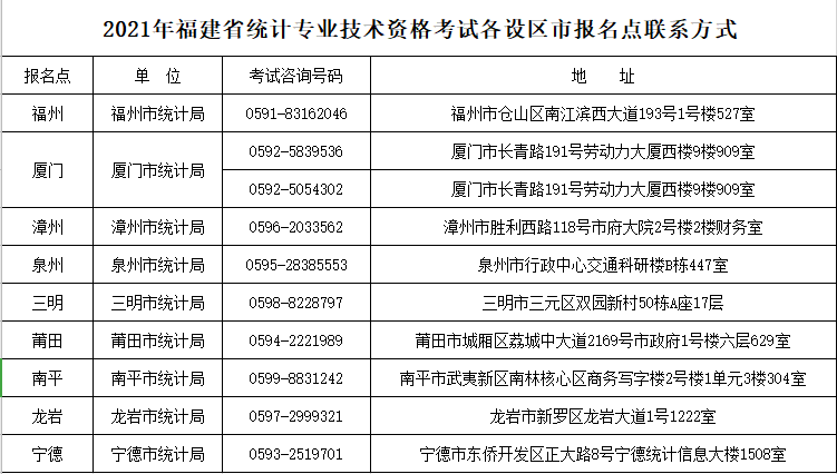 2021年福建省統(tǒng)計專業(yè)技術資格考試各設區(qū)市報名點聯(lián)系方式