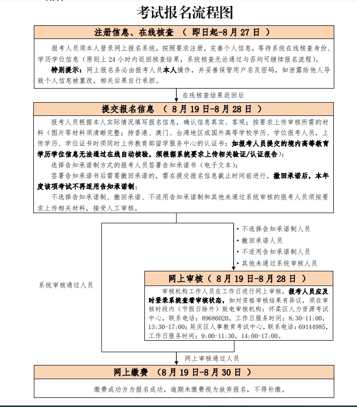 (一)考試報名證明事項推行告知承諾制報考人員須確定本人符合報名條件,承諾填報的信息均真實、客觀,并簽署《專業(yè)技術(shù)人員職業(yè)資格考試報名證明事項告知承諾書》(電子文本),切勿委托他人或機構(gòu)填寫報名信息、代替本人作出書面(含電子文本)承諾?荚嚱M織機構(gòu)將在考前考中、考后對報考人員承諾的內(nèi)容開展核查,成績合格擬取得資格證書人員信息將在北京市人力資源和社會保障局官網(wǎng)(https://rsj.beijing.gov.cn/,下同)“人事考試服務(wù)頻道’-“成績查詢”欄目進行公示,接受社會監(jiān)督。不實填報、虛假承諾的人員將被記入專業(yè)技術(shù)人員資格考試誠信檔案庫,納入全國信用信息共享平臺,接受“一處失信、處處受限”的聯(lián)合懲戒處罰,涉嫌犯罪的,移送司法機關(guān)處理。