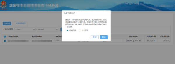 2.勾選需要開具繳費(fèi)證明的繳費(fèi)信息,點(diǎn)擊開具按鈕,可選擇一種開具方式。選擇明細(xì)開具,系統(tǒng)按照查詢結(jié)果進(jìn)行證明開具,選擇匯總開具,系統(tǒng)會將費(fèi)款所屬期連續(xù)的,單位編號、險種等信息相同的數(shù)據(jù)會合并成一條記錄。