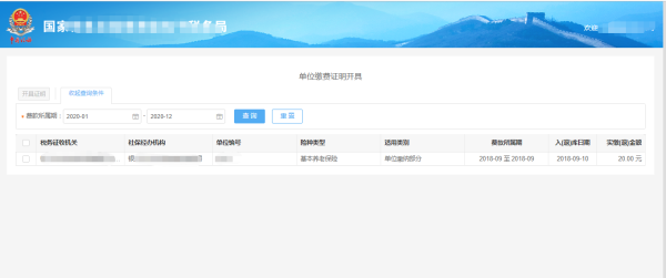 1.進(jìn)入單位繳費(fèi)證明開具功能。系統(tǒng)默認(rèn)查詢出當(dāng)年所有的繳費(fèi)信息,您可修改查詢條件——費(fèi)款所屬期查詢歷史年度的繳費(fèi)信息。