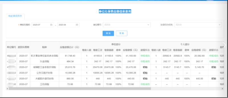 2.單位社保費(fèi)應(yīng)繳信息查詢。單位應(yīng)繳信息功能可查看單位全部的預(yù)處理信息,包括未申報(bào)、申報(bào)中、已申報(bào)的數(shù)據(jù)。系統(tǒng)默認(rèn)查詢當(dāng)月的預(yù)處理信息,用戶可通過修改費(fèi)款所屬期,查看其它屬期的預(yù)處理信息。