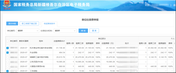2.用戶勾選需要申報(bào)的數(shù)據(jù),請注意同一批次的繳費(fèi)數(shù)據(jù)需要一起申報(bào)。點(diǎn)擊申報(bào)按鈕,系統(tǒng)發(fā)起申報(bào),提示申報(bào)已提交,用戶可進(jìn)入申報(bào)繳費(fèi)查詢功能進(jìn)行繳費(fèi)。