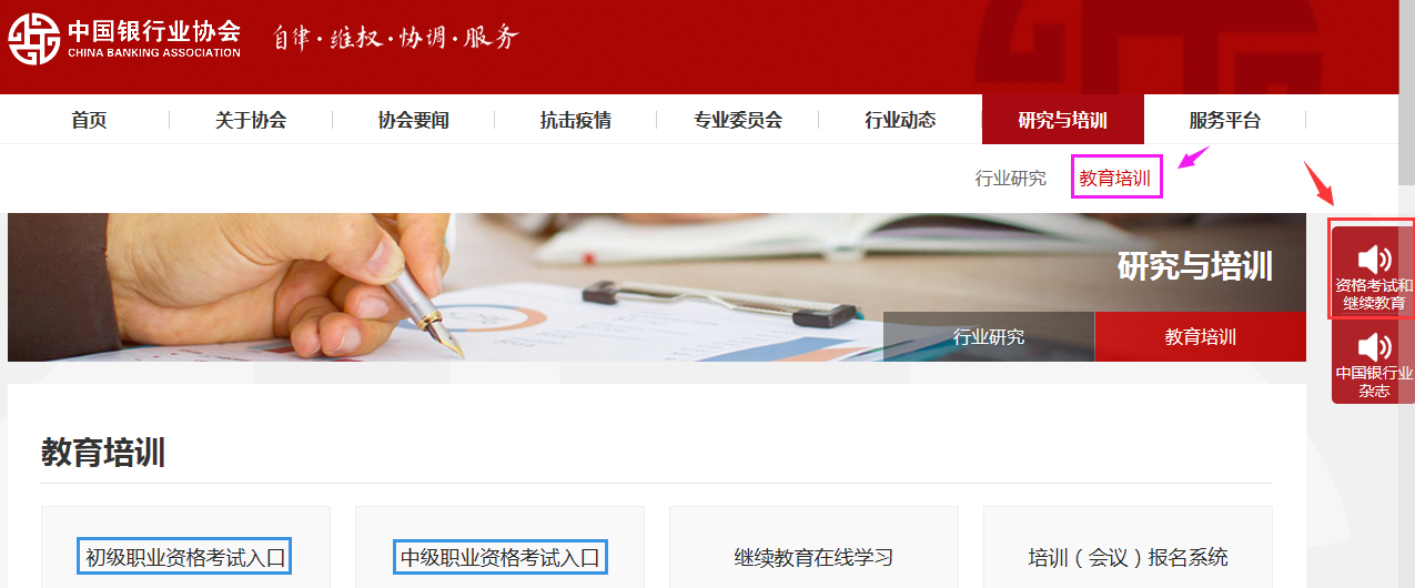 第二步:點(diǎn)擊【研究與培訓(xùn)專區(qū)】—【教育培訓(xùn)】或直接點(diǎn)擊右側(cè)【資格考試和繼續(xù)教育】