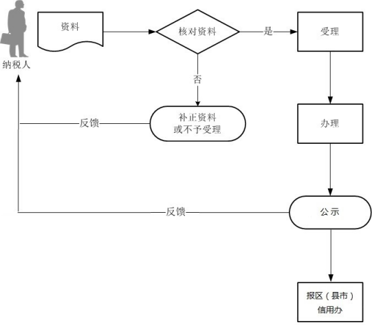 辦稅服務(wù)廳接收資料,核對資料是否齊全、是否符合法定形式、填寫內(nèi)容是否完整,符合的即時受理;資料不符合的當(dāng)場一次性告知應(yīng)補正資料,不符合修復(fù)條件的不予受理并出具《不予信用修復(fù)告知書》。