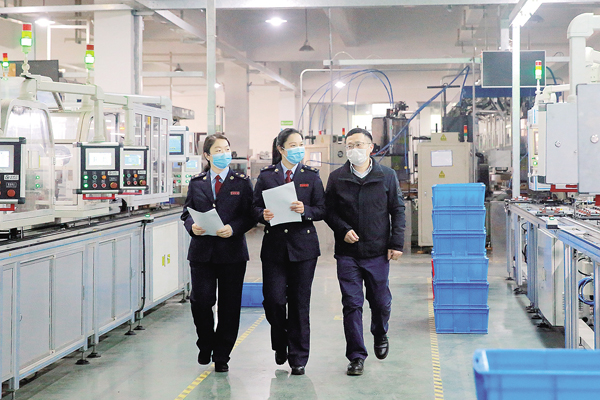 圖為臨海市稅務(wù)局稅務(wù)人員走訪吉利汽車臨海生產(chǎn)基地,了解企業(yè)供應(yīng)鏈情況。