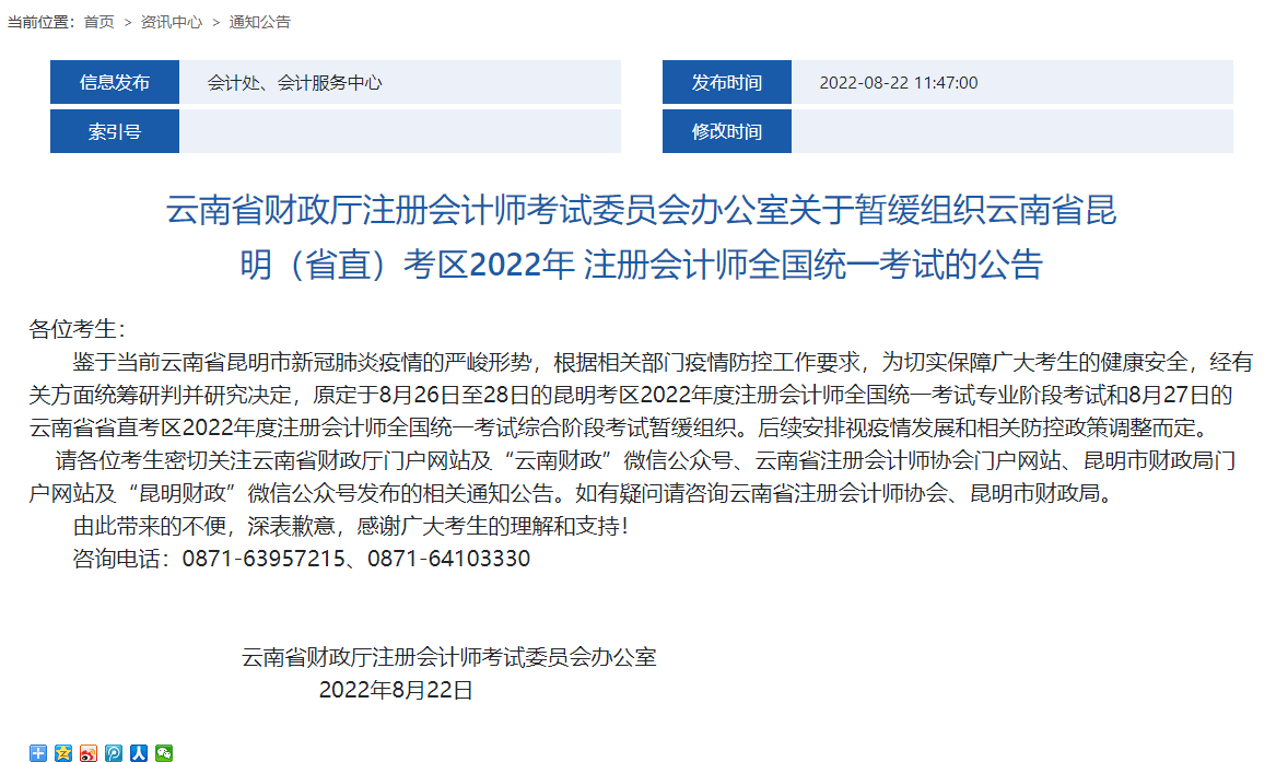 鑒于當(dāng)前云南省昆明市新冠肺炎疫情的嚴(yán)峻形勢,根據(jù)相關(guān)部門疫情防控工作要求,為切實(shí)保障廣大考生的健康安全,經(jīng)有關(guān)方面統(tǒng)籌研判并研究決定,原定于8月26日至28日的昆明考區(qū)2022年度注冊會計師全國統(tǒng)一考試專業(yè)階段考試和8月27日的云南省省直考區(qū)2022年度注冊會計師全國統(tǒng)一考試綜合階段考試暫緩組織。后續(xù)安排視疫情發(fā)展和相關(guān)防控政策調(diào)整而定。 請各位考生密切關(guān)注云南省財政廳門戶網(wǎng)站及“云南財政”微信公眾號、云南省注冊會計師協(xié)會門戶網(wǎng)站、昆明市財政局門戶網(wǎng)站及“昆明財政”微信公眾號發(fā)布的相關(guān)通知公告。如有疑問請咨詢云南省注冊會計師協(xié)會、昆明市財政局。