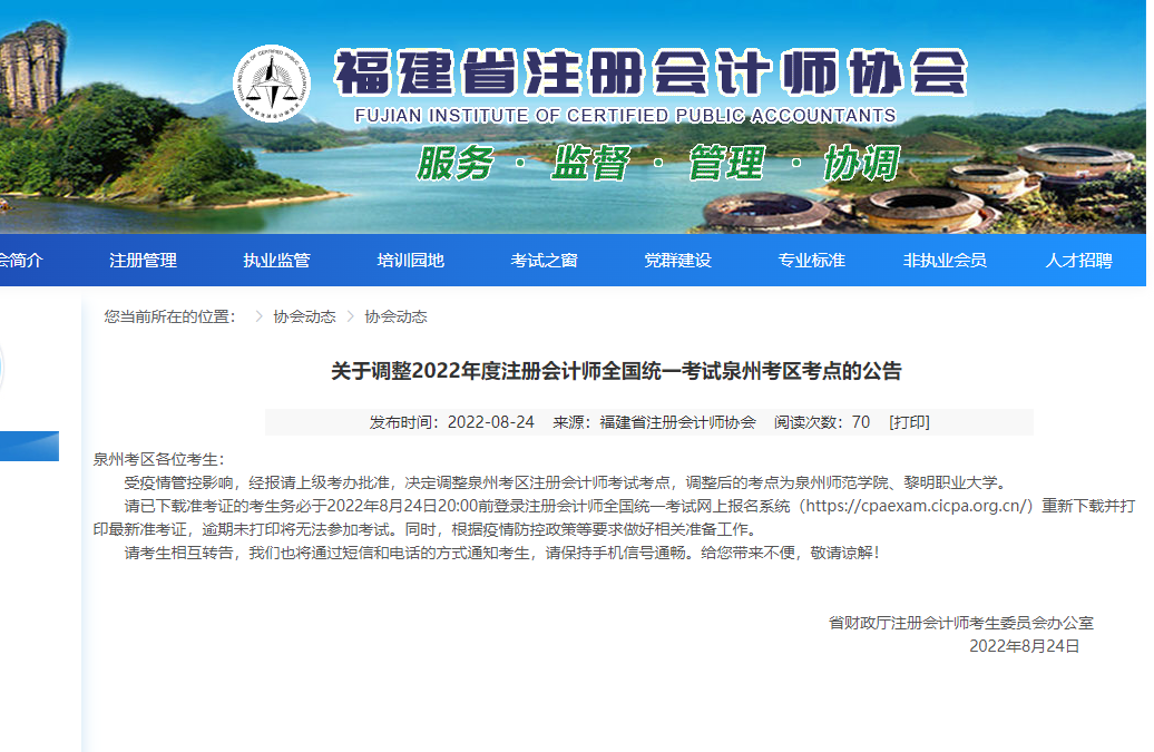 受疫情管控影響,經(jīng)報(bào)請上級考辦批準(zhǔn),決定調(diào)整泉州考區(qū)注冊會(huì)計(jì)師考試考點(diǎn),調(diào)整后的考點(diǎn)為泉州師范學(xué)院、黎明職業(yè)大學(xué)。