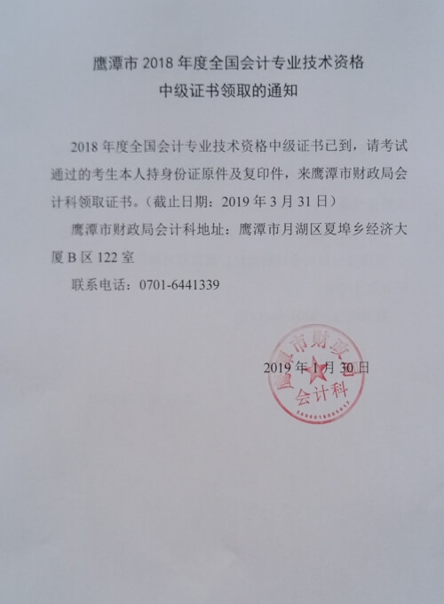 江西鷹潭市2018中級會計職稱考試可以領取證書啦!鷹潭市2018年中級會計師考試合證書已到,證書領取2019年3月31日截止,成績合格人員請攜帶考生本人身份證原件及復印件,到鷹潭市財政局領取證書。
