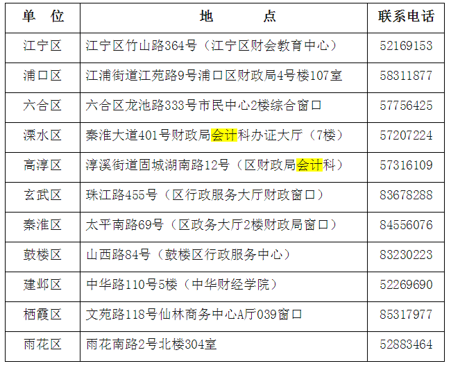 南京市2018年度全國會計(jì)專業(yè)技術(shù)中級資格考試成績合格的考生,請攜帶本人身份證,自2019年2月20日起到報(bào)名所在區(qū)領(lǐng)取合格證書。領(lǐng)取時(shí)間:周一至周五上午9:00--11:30;下午14:00-17:00,領(lǐng)取地點(diǎn)及聯(lián)系電話如下: