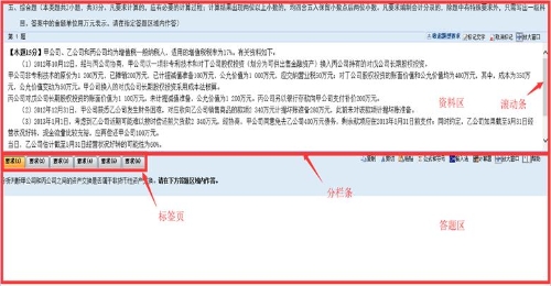 (1) 計(jì)算分析題、簡答題、綜合題都是上下分欄,上欄為資料區(qū),下欄為答題區(qū)。考生可根據(jù)需要上下拖動分欄條和右側(cè)滾動條,調(diào)整資料區(qū)或答題區(qū)的可視區(qū)域。答題區(qū)根據(jù)考試題目要求分為“要求(1)”、“要求(2)”、“要求(3)”等多項(xiàng)標(biāo)簽頁?忌凑找笤诟髯源痤}區(qū)域內(nèi)進(jìn)行答題。