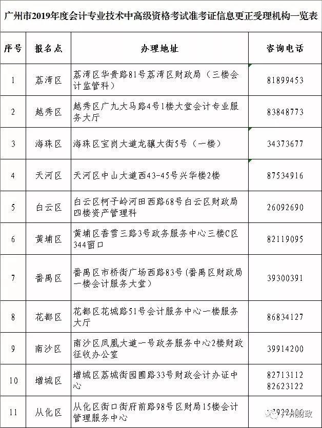 附件:廣州市2019年度會計專業(yè)技術中高級資格考試準考證信息更正受理機構一覽表