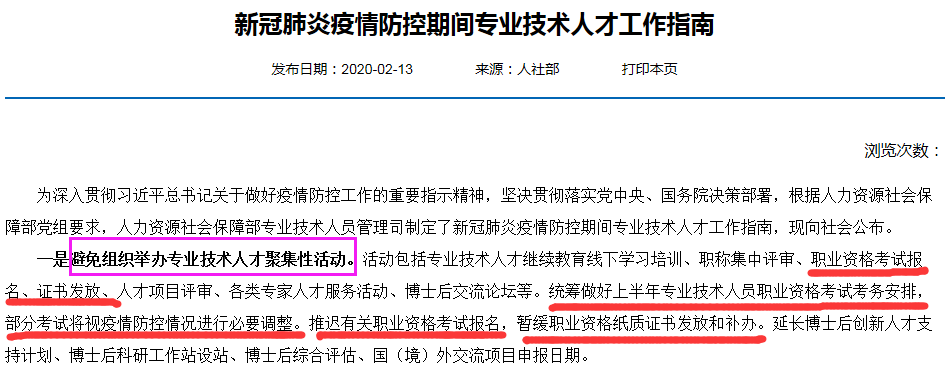 人社部要求:避免組織舉辦專業(yè)技術(shù)人才聚集性活動(dòng)。統(tǒng)籌做好上半年專業(yè)技術(shù)人員職業(yè)資格考試考務(wù)安排,部分考試將視疫情防控情況進(jìn)行必要調(diào)整。推遲有關(guān)職業(yè)資格考試報(bào)名,暫緩職業(yè)資格紙質(zhì)證書發(fā)放和補(bǔ)辦。對(duì)參與抗擊新冠肺炎疫情的一線專業(yè)技術(shù)人才評(píng)審職稱時(shí)予以傾斜,對(duì)做出突出貢獻(xiàn)的開辟綠色通道,直接申報(bào)評(píng)審高級(jí)職稱。截圖如下: