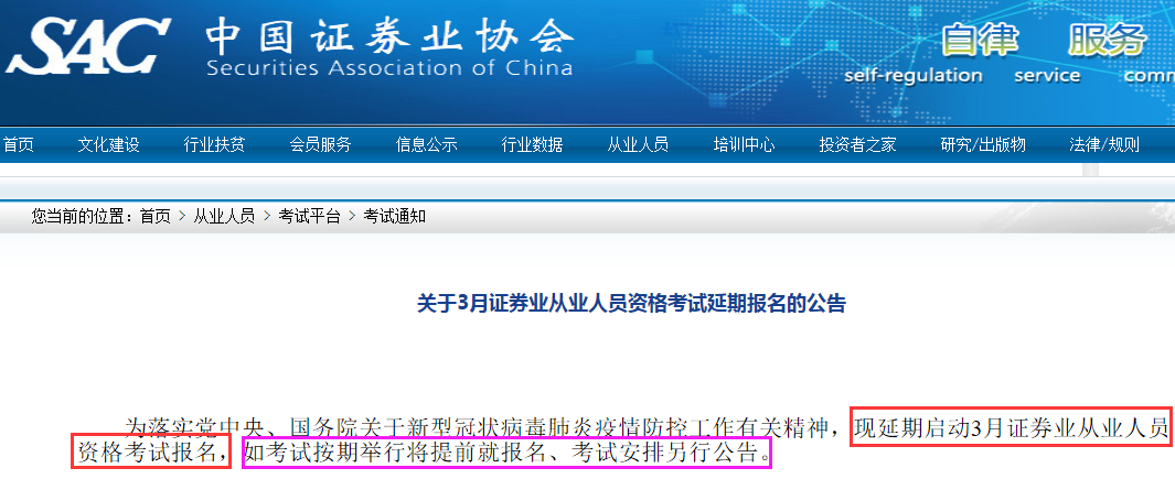 2020年2月5日,中國證券業(yè)協(xié)會發(fā)布通告,延期啟動3月證券從業(yè)資格考試報(bào)名,報(bào)名時(shí)間及考試安排另行公告。