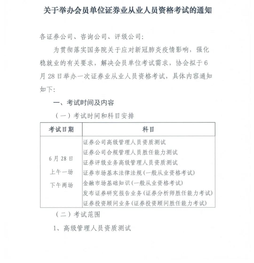 自今年2月5日,中國證券業(yè)協(xié)會發(fā)布3月證券從業(yè)資格考試延期報名的消息之后,至今已有4個月時間無相關(guān)動態(tài)。不過,雖然大規(guī)?荚嚿袩o法進行,但協(xié)會已經(jīng)悄悄地為會員單位提供了一份貼心大禮包。日前,中國證券業(yè)協(xié)會向各證券公司、咨詢公司、評級公司下發(fā)《關(guān)于舉辦會員單位證券業(yè)從業(yè)人員資格考試的通知》。為解決會員單位考試需求,協(xié)會擬于6月28日舉辦一次證券業(yè)從業(yè)人員資格考試,參考人員為會員單位的在職員工。