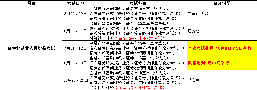 原計劃定于8月29日至30日舉辦的考試擬推遲到9月中旬舉行。目前2020年9月證券從業(yè)資格考試報名時間暫未公布,按照報考規(guī)律,證券從業(yè)資格報名時間一般為考前1-2個月進(jìn)行,考前10天左右截止報名。