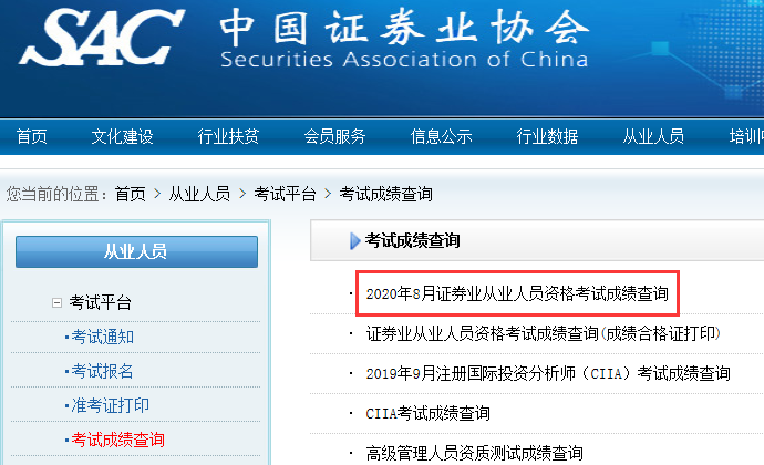 2020年8月證券從業(yè)資格考試成績?nèi)肟?月10日16:30已開通,考生登錄中國證券業(yè)協(xié)會成績查詢欄目即可查詢成績。進入中國證券業(yè)協(xié)會網(wǎng)上報名平臺,選擇當次考試時間右側(cè)的成績查詢按鈕查詢成績。每次證券考試成績查詢的鏈接不一樣,選擇你參加考試的時間右側(cè)選擇成績查詢,輸入證件號碼和姓名、驗證碼查詢。合格、不合格、缺考都可以查詢到成績或缺考記錄。