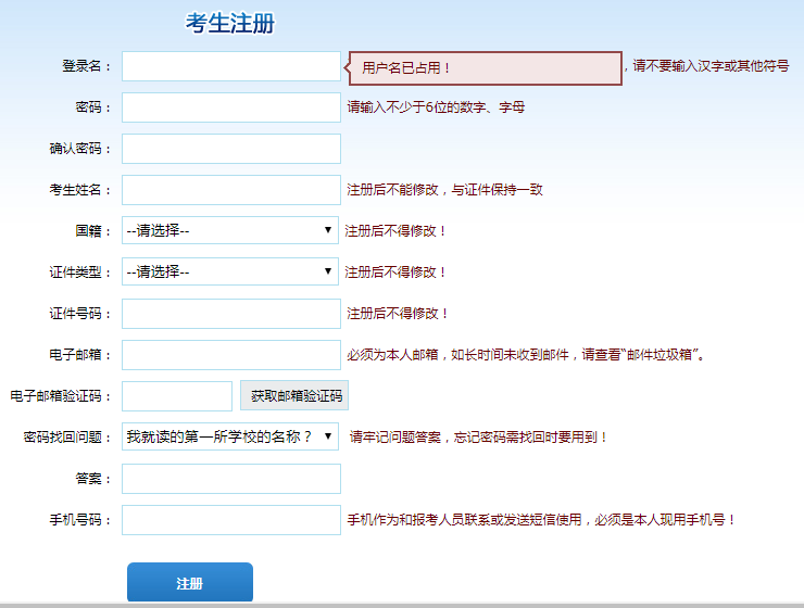 填寫用戶名、密碼、考生姓名、國籍、證件類別、證件號碼、電子信箱、設(shè)置密碼答案、手機(jī)號碼等信息。