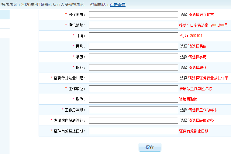 4.填寫考生姓名、證件類別、證件號碼、國籍、電子信箱、性別、出生日期、居住地市、通訊地址、郵編、民族、學(xué)歷、職業(yè)、證券行業(yè)從業(yè)年限、工作單位、職位、工作總年限等信息、(提示:標(biāo)記為*的部分為必填項(xiàng)。)